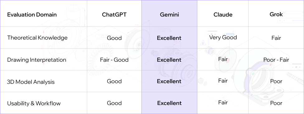- Why it won: Gemini outperformed the field in 3D DFM analysis and technical drawing interpretation. It provided the most coherent explanations for geometric issues and suggested realistic fixes.