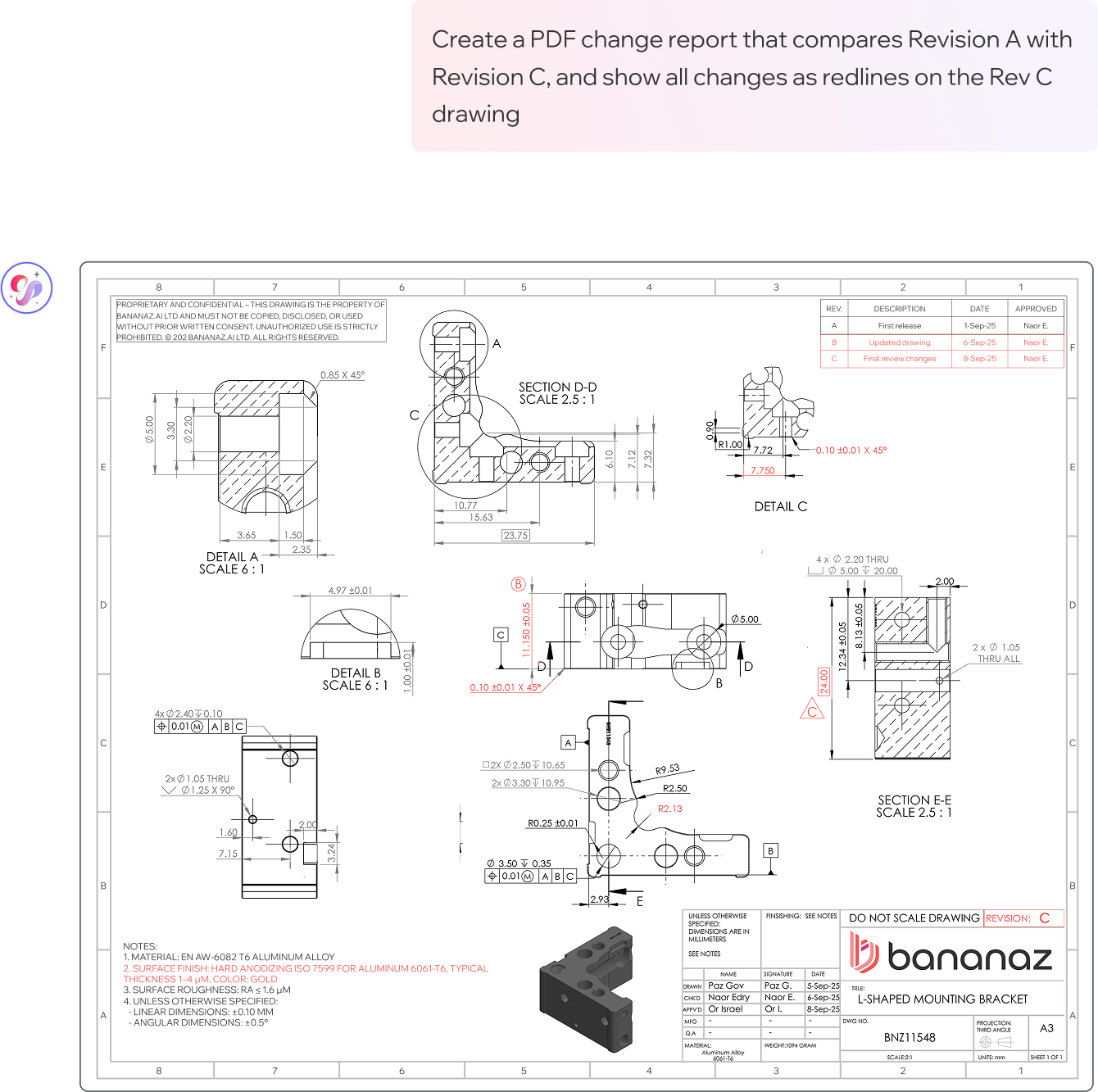 In R&D, speed comes from getting ideas right early. bananaz runs AI-driven design checks on both 2D drawings and 3D models during the ideation phase, and engineers can explore concepts freely while the system continuously flags errors, missing details, and standard violations in real time.